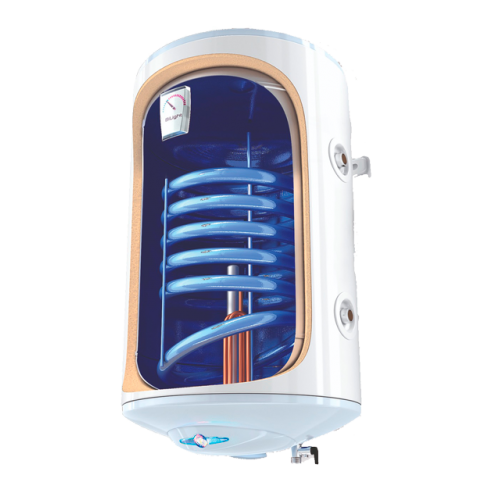 Принцип действия водонагревателей косвенного нагрева прост и заключается в следующем: нагревательный элемент (ТЭН) такого прибора не сам вырабатывает тепло, а подключается к газовому или твердотопливному котлу, или солнечному коллектору. Вода или другой теплоноситель, который циркулирует по отопительной системе, циркулируя по ТЭНу водонагревателя, отдает тепло воде, находящейся в баке. Нагрев воды таким способом намного экономичнее и быстрее в сравнении с обычным электрическим водонагревателем, а в тех случаях, когда нагрузка на электрическую сеть велика, косвенный нагрев может оказаться единственным способом горячего водоснабжения. Кроме того, большинство водонагревателей косвенного типа имеют повышенный коэффициент производительности, и если Вам нужно обеспечить горячей водой значительное количество потребителей, то бойлер косвенного нагрева – это одно из наиболее рациональных и экономически эффективных решений.