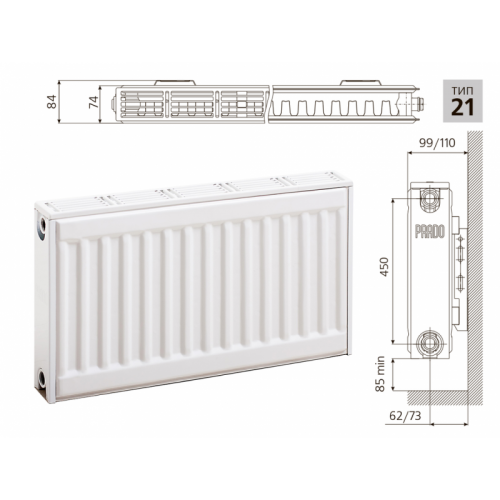 Радиаторы «PRADO» изготавливаются из высококачественной холоднокатаной стали толщиной 1,25 мм и представляют собой панельные отопительные приборы регистрового типа с горизонтальными коллекторами вверху и внизу каждой панели, соединёнными вертикальными каналами с шагом 33,3 мм по длине прибора (3 канала на каждые 100 мм длины). По контуру панели сварены сплошным швом, между каналами - «незаметной» с фронта точечной сваркой. «М»-образное оребрение толщиной 0,4 мм приварено точечной сваркой непосредственно к вертикальным каналам, предназначенным для прохода теплоносителя.