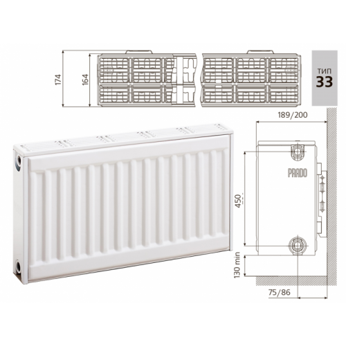 Радиаторы «PRADO» изготавливаются из высококачественной холоднокатаной стали толщиной 1,25 мм и представляют собой панельные отопительные приборы регистрового типа с горизонтальными коллекторами вверху и внизу каждой панели, соединёнными вертикальными каналами с шагом 33,3 мм по длине прибора (3 канала на каждые 100 мм длины). По контуру панели сварены сплошным швом, между каналами - «незаметной» с фронта точечной сваркой. «М»-образное оребрение толщиной 0,4 мм приварено точечной сваркой непосредственно к вертикальным каналам, предназначенным для прохода теплоносителя.