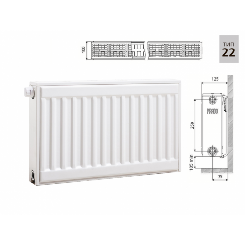Радиаторы «PRADO» изготавливаются из высококачественной холоднокатаной стали толщиной 1,25 мм и представляют собой панельные отопительные приборы регистрового типа с горизонтальными коллекторами вверху и внизу каждой панели, соединёнными вертикальными каналами с шагом 33,3 мм по длине прибора (3 канала на каждые 100 мм длины). По контуру панели сварены сплошным швом, между каналами - «незаметной» с фронта точечной сваркой. «М»-образное оребрение толщиной 0,4 мм приварено точечной сваркой непосредственно к вертикальным каналам, предназначенным для прохода теплоносителя.